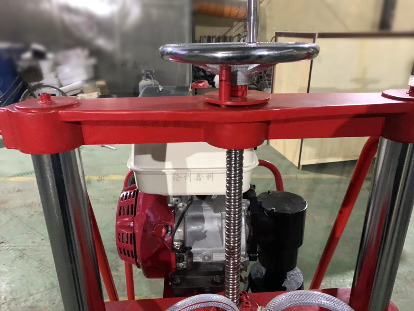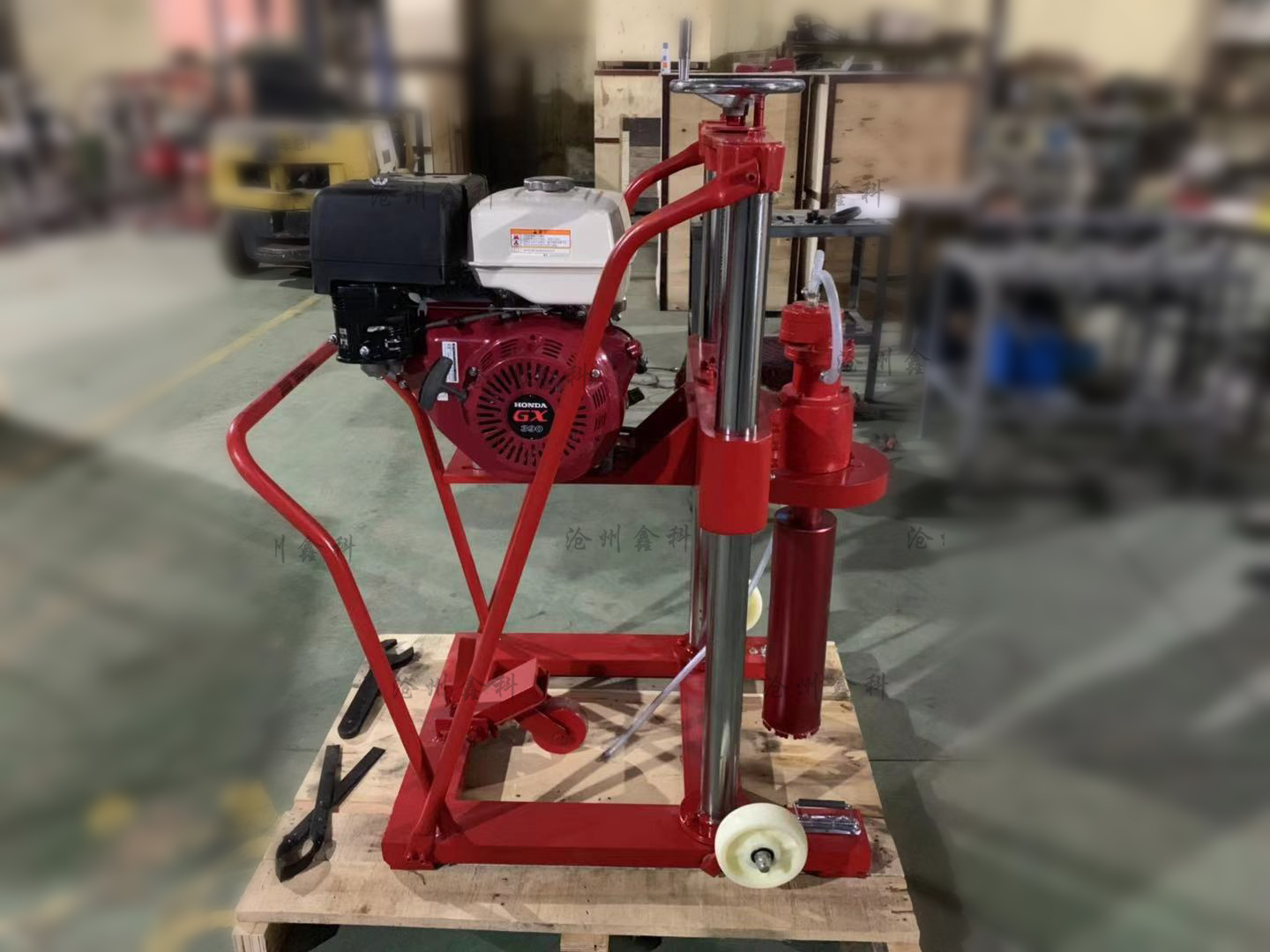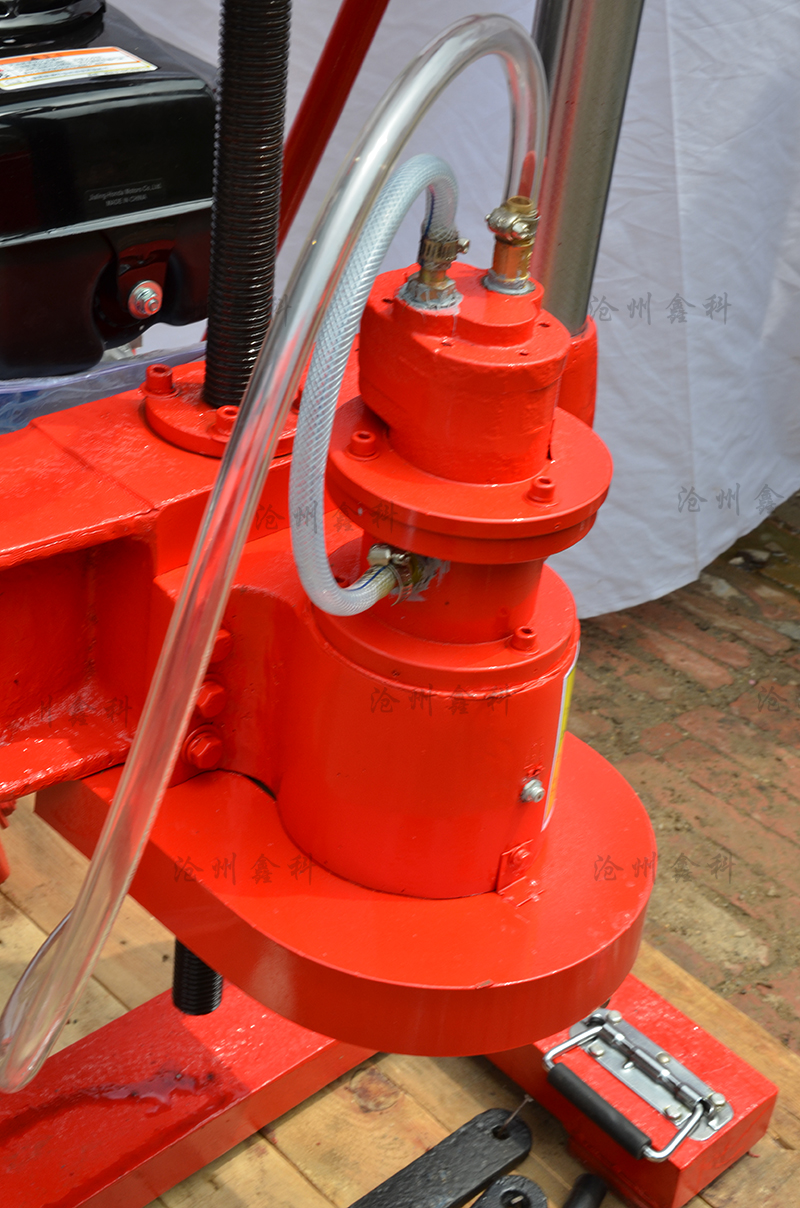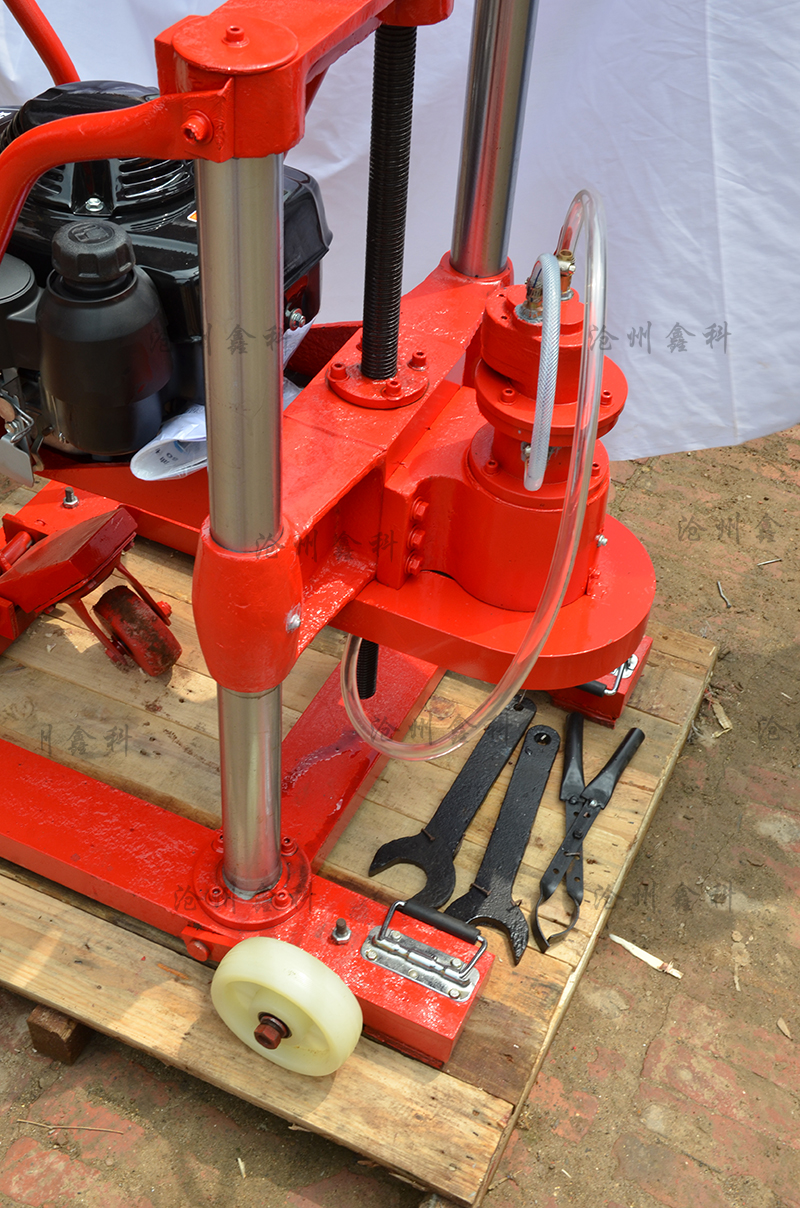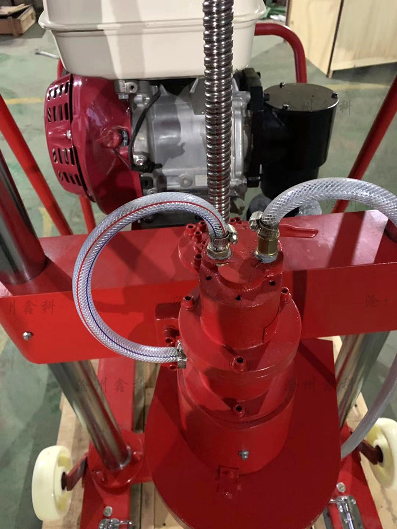 5、開孔:以上作業做好后,即可開孔作業,裝上鉆頭,起動汽油機(詳情見汽油機用戶手冊)把進水管放入水桶內,水桶要提到高出水泵位置,然后手捏氣襄把水吸入水泵,水泵上水后把水桶放在地面即可。油門調至z大,開始輕搖給進手柄,使鉆頭緩慢接觸地面。開孔要訣:先給水后鉆進,給進速度要慢,鉆壓要小。嚴禁無水作業,以免燒壞鉆頭和水封。